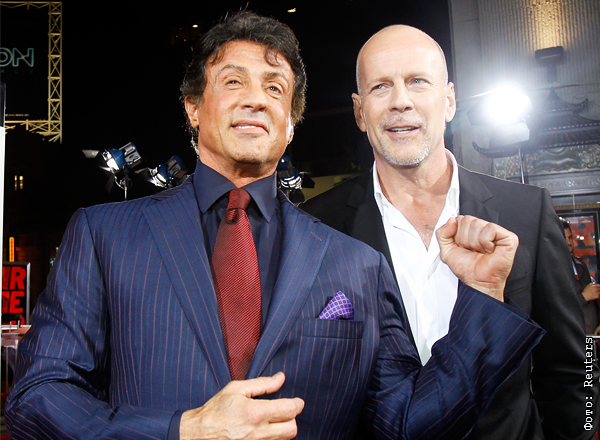 Актеры Сильвестр Сталлоне и Брюс Уиллис на специальном показе фильма "РЭД" в китайском театре Граумана в Лос-Анджелесе, октябрь 2010 год