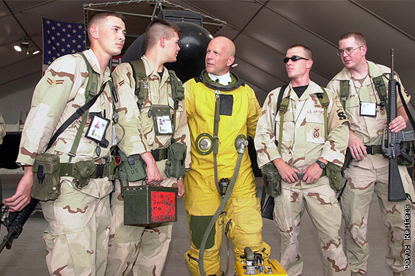 Брюс Уиллис вместе с представителями Объединенной организации обслуживания вооруженных сил (USO) на территории военной базы, сентябрь 2003 год