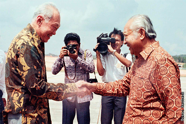 Президент Индонезии Сухарто (справа) пожимает руку премьер-министру Сингапура Ли Куан Ю в аэропорту Джакарты, август 1990 год