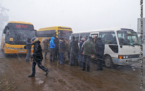 Спасенные моряки у автобусов в порту Корсакова