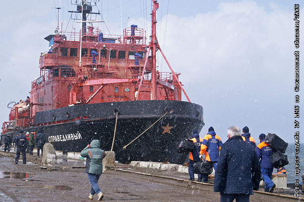 Судно "Справедливый", доставившее выживших моряков и тела погибших членов экипажа с затонувшего траулера "Дальний Восток", в порту Корсакова