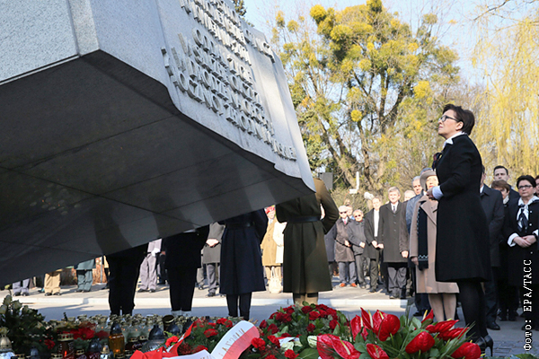 Премьер-министр Польши Ева Копач у памятника жертвам катастрофы на Повонзковском военном кладбище в Варшаве
