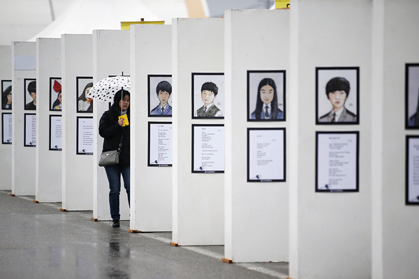 Изображения жертв катастрофы в мемориальном зале южнокорейского города Ансан, где обучались 250 учеников, погибших в результате кораблекрушения