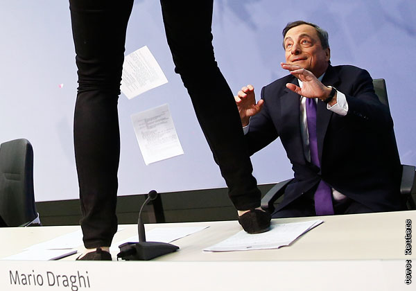 Девушка запрыгивает на стол председателя Европейского центрального банка Марио Драги во время пресс-конференции во Франкфурте