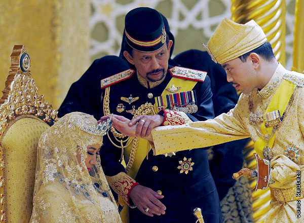 Султан Брунея Хассанал Болкиах благословляет своего сына принца Абдулу Малика во время церемонии бракосочетания в королевском дворце