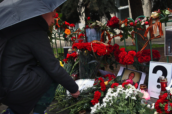 У посольства Украины в Москве прошла акция памяти убитого в Киеве журналиста Олеся Бузины. Напротив здания посольства появился импровизированный мемориал с фотографиями, цветами и свечами.