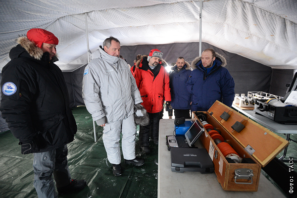 Заместитель председателя правительства РФ Дмитрий Рогозин (второй слева) и министр природных ресурсов и экологии РФ Сергей Донской (третий слева) на открытии дрейфующей станции