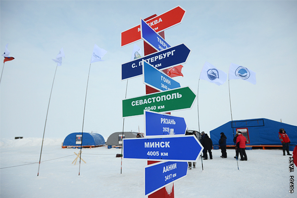Верстовой столб на российской дрейфующей станции "Северный полюс-2015"