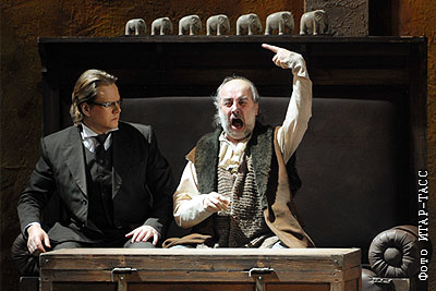 Актеры Алексей Марков (в роли Ивана) и Николай Гассиев (в роли Федора Карамазова) (слева направо) в сцене из оперы "Братья Карамазовы" на открытии фестиваля "Премьеры Мариинского театра"