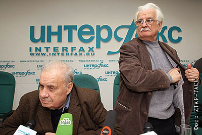 Режиссер Эльдар Рязанов и избранный новым председателем СК РФ режиссер Марлен Хуциев на пресс-конференции по поводу ситуации, сложившейся вокруг Союза кинематографистов