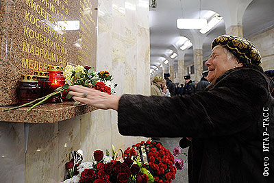 Родственники погибших в результате теракта 6 февраля 2004 года на перегоне между станциями Московского метрополитена "Павелецкая" и "Автозаводская" на дне памяти у мемориальной доски