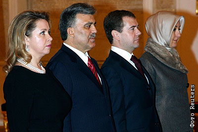 Супруга президента России Светлана Медведева, президент Турции Абдуллах Гюль, президент России Дмитрий Медведев, супруга президента Турции Хайрюнниса Гюль во время официальной церемонии встречи в Большом Кремлевском дворце