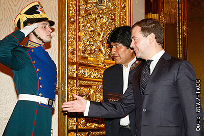 Президент Боливии Эво Моралес и президент России Дмитрий Медведев перед началом переговоров в Кремле