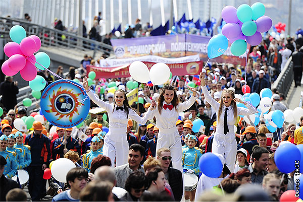 Участники первомайского шествия на мосту через бухту Золотой рог