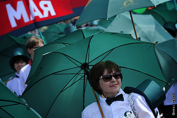 Участница первомайского шествия на мосту через бухту Золотой рог. Владивосток.