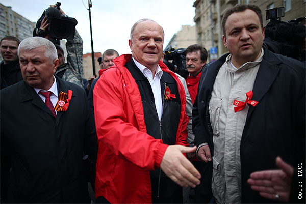 Лидер партии КПРФ Геннадий Зюганов (в центре) во время первомайской демонстрации левых сил на Калужской площади