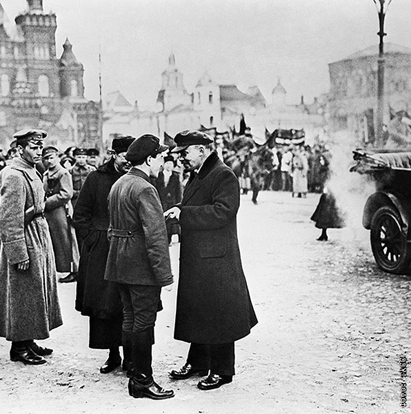 Ленин (в центре) беседует на Красной площади с секретарем МК РКП(б) Загорским во время первомайской демонстрации. 1919 год.