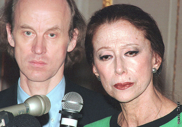 Майя Плисецкая и ее бывший партнер по сцене Борис Акимов во время пресс-конференции накануне гала-концерта, посвященного 75-летию великой балерины. 2000 год.