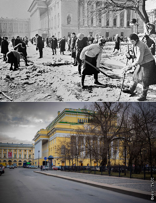 Ленинград, 1943 год. Жители города убирают лед у театра драмы имени А. С. Пушкина.