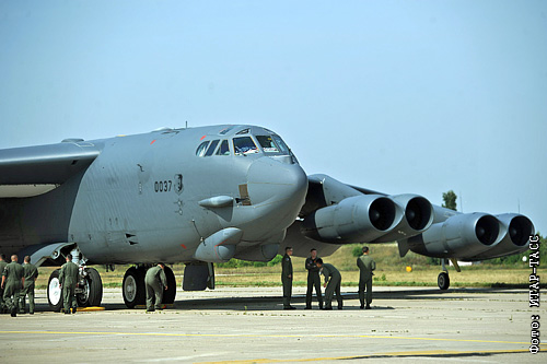 Американские военнослужащие у бомбардировщика Б-52 на аэродроме Раменское