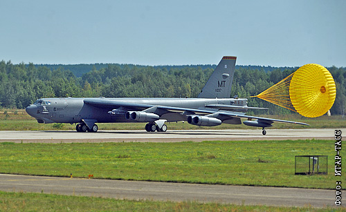 Американский бомбардировщик Б-52 после приземления на аэродроме Раменское