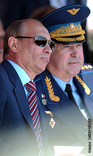 Премьер-министр РФ Владимир Путин и главнокомандующий ВВС России Александр Зелин на международном авиасалоне МАКС-2011 в Жуковском.
