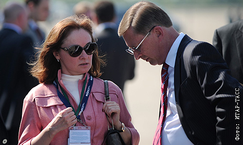 Министр экономического развития РФ Эльвира Набиуллина и вице-премьер РФ Сергей Иванов на международном авиасалоне МАКС-2011 в Жуковском
