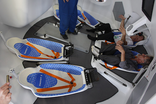 Посетители внутри пилотируемого космического корабля "Русь" на международном авиасалоне МАКС-2011 в Жуковском