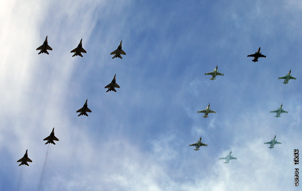Экипажи МиГ-29 и Су-25 выстраивают в небе число "70" в честь 70-летия Победы в Великой Отечественной войне