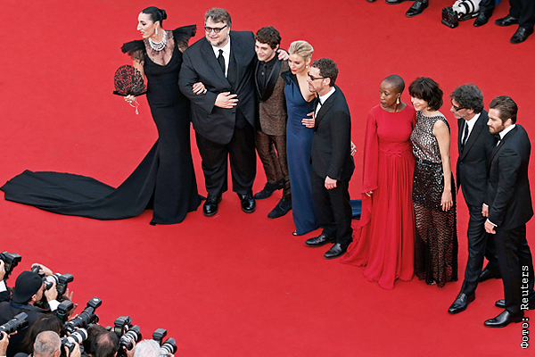 Актер Джейк Джилленхол, режиссер Джоэл Коэн, актриса Софи Марсо, певица Рокия Траоре, режиссер Итан Коэн, актриса Сиенна Миллер, режиссер Ксавье Долан, режиссер Гильермо дель Торо и актриса Росси де Пальма (справа налево) на красной дорожке 68-го Каннского кинофестиваля