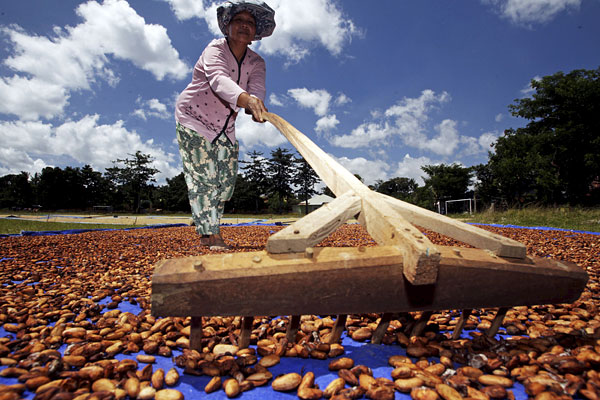 Сушка какао-бобов на плантации в деревне Гантаранг. Индонезия.