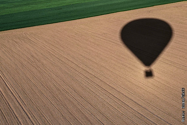 Тень от воздушного шара на поле в заповеднике "Чешский рай" на северо-востоке Чехии