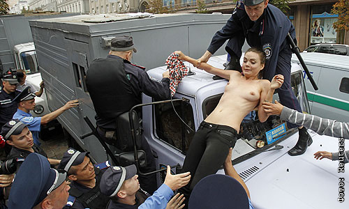 Представители женского движения FEMEN провели акцию в поддержку оппозиции неподалеку от здания Печерского райсуда Киева, где проходит суд над экс-премьером Юлией Тимошенко