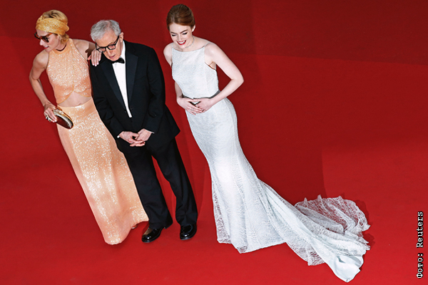 Актриса Паркер Поузи, режиссер Вуди Аллен и актриса Эмма Стоун (слева направо) на красной ковровой дорожке перед показом фильма "Иррациональный человек"