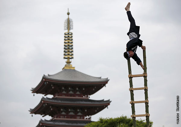 Акробат выполняет трюк во время памятных мероприятий, посвященных погибшим при исполнении своих обязанностей пожарным. Токио, Япония.