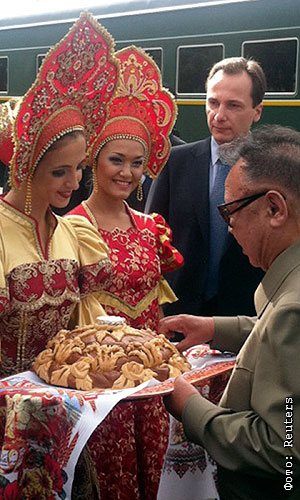 Руководитель КНДР Ким Чен Ир, находящийся с официальным визитом в Россию, в воскресенье прибыл в Амурскую область. На перроне его встречали традиционным русским караваем