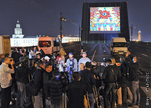 Во время показа анимационных фильмов в стилистике граффити на разведенном своде Дворцового моста, который прошел в рамках международного арт-форума " Петербургские граффити-2011. "Графффест "