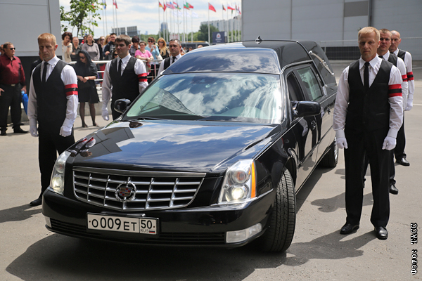 Сотрудники ритуальной службы сопровождают катафалк с телом певицы