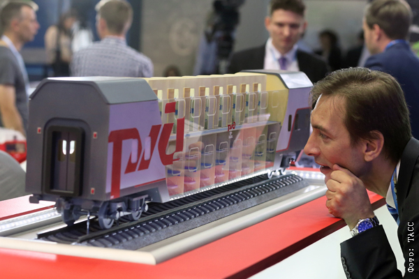 Один из участников форума с нескрываемым интересом рассматривает макет вагона на территории выставочного комплекса "Ленэкспо"