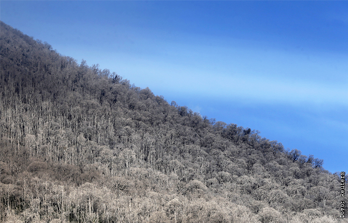 Деревья и растительность покрыты вулканическим пеплом