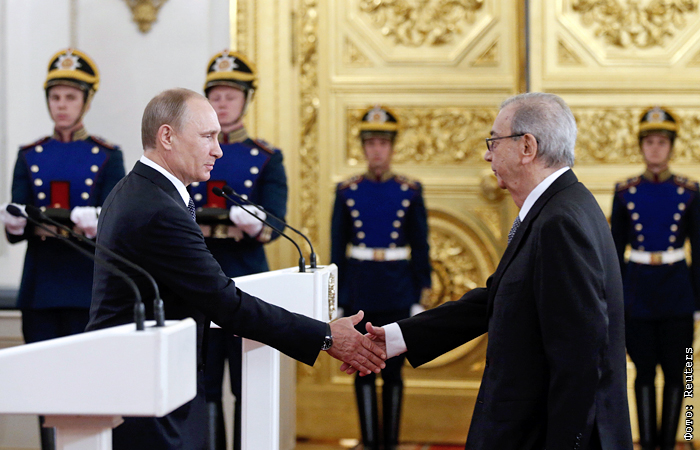 Президент России Владимир Путин и государственный общественный деятель Евгений Примаков на торжественной церемонии вручения государственных премий РФ в области науки и технологий, литературы, искусства и гуманитарной деятельности в Георгиевском зале Большого Кремлевского дворца, июнь 2014 год