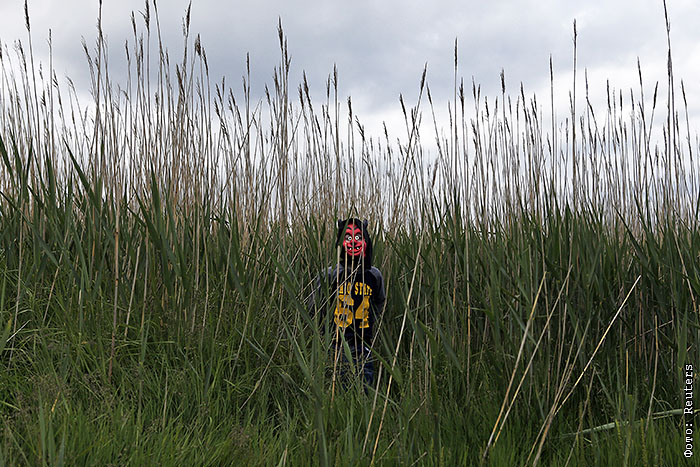 Мальчишка в маске дьявола в кустах на берегу реки в Ирландии