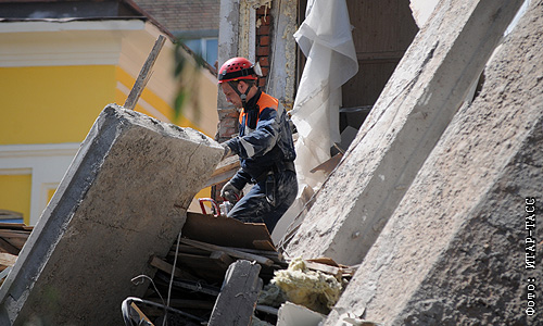Сотрудник МЧС на месте обрушения стены в пятиэтажном доме, расположенном на улице Посьетской.