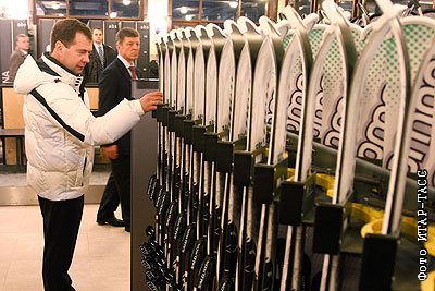 Президент РФ Дмитрий Медведев во время посещения строящегося горнолыжного комплекса "Роза Хутор"