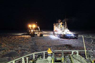 Ледоколы "Красин" и "Адмирал Макаров" во время операции по спасению судов, затертых льдами в Сахалинском заливе Охотского моря