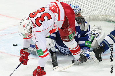 Игрок "Спартака" Юрай Микуш (слева) забивает гол в ворота голкипера "Динамо" Алексея Волкова (справа) в матче чемпионата КХЛ : "Динамо" (Москва) - "Спартак" (Москва)