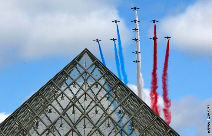 Самолеты "Альфа Джет" пилотажной группы "Патруль де Франс" выпускают дым с цветами национального флага над Лувром