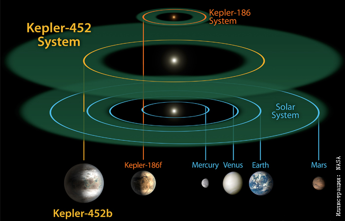 Экзопланета Kepler 452b вращается вокруг своей звезды в так называемой "зоне жизни", то есть там, где температурные и другие условия позволяют предположить существование живых организмов. Ширина "зоны жизни" у системы Kepler 452b примерно соответствует ширине этой зоны в Солнечной системе. У открытой ранее звездной системы Kepler 186f эта зона значительно меньше, поскольку вся эта система уступает в размерах Солнечной, а ее звезда более холодная. (На иллюстрации сравнительные размеры звездных систем Kepler 452b, Kepler 186f и Солнечной системы)