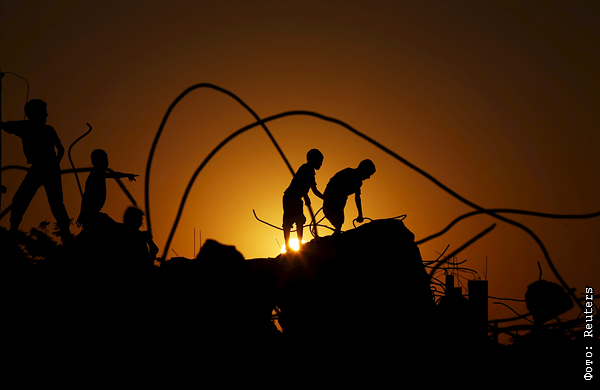 Палестинские дети играют на руинах дома, разрушенного во время артобстрела