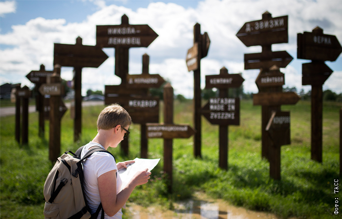 Посетитель рядом с указателями на фестивале в деревне Звизжи